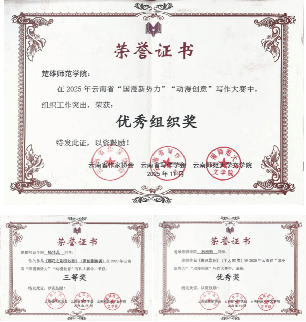 近日,由云南省作家协会、云南省写作学会、云南师范大学文学院联合主办的2025年云南省“国漫新势力”动漫创意写作大赛圆满收官。我校学子在本届比赛中表现突出...