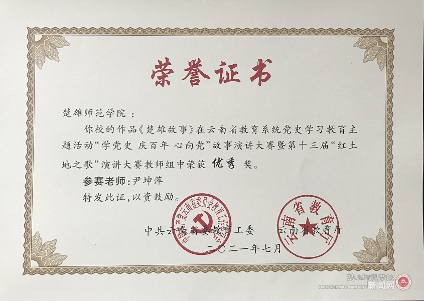 云南省教育系统“学党史 庆百年 心向党”故事演讲大赛暨第十三届“红土地之歌”演讲大赛是由中共云南省委教育工委、云南省教育厅主办的教育系统党史学习教育主题活动。本次大赛分为初赛、复赛、决赛三个阶段,教师组、高校组、中学组、小学组、幼儿园组五个组别。全省报送21808个初赛作品,我校推送的两个作品(每所学校推送2个作品)均进入决赛。经层层推荐、专家遴选审议,评选出特等奖5名,一等奖15名,二等奖30名,三等奖40名,优秀奖1000名,最佳人气奖200名。我校教育学院江燕老师作品《红色的种子 金色的梦想》荣获高校教师组二等奖,姚丽娜同学作品《一盏星火照我心》(指导教师:孙梅娟)荣获高校学生组二等奖,校团委尹坤萍老师作品《楚雄故事》荣获教师组优秀奖。