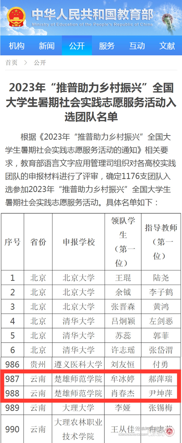 日前,教育部公布2023年“推普助力乡村振兴”全国大学生暑期社会实践志愿服务活动团队入选名单,确定1176支团队入选参加2023年“推普助力乡村振兴”全国大学生暑期社会实践志愿服务活动,我校2支团队入选国家级团队。