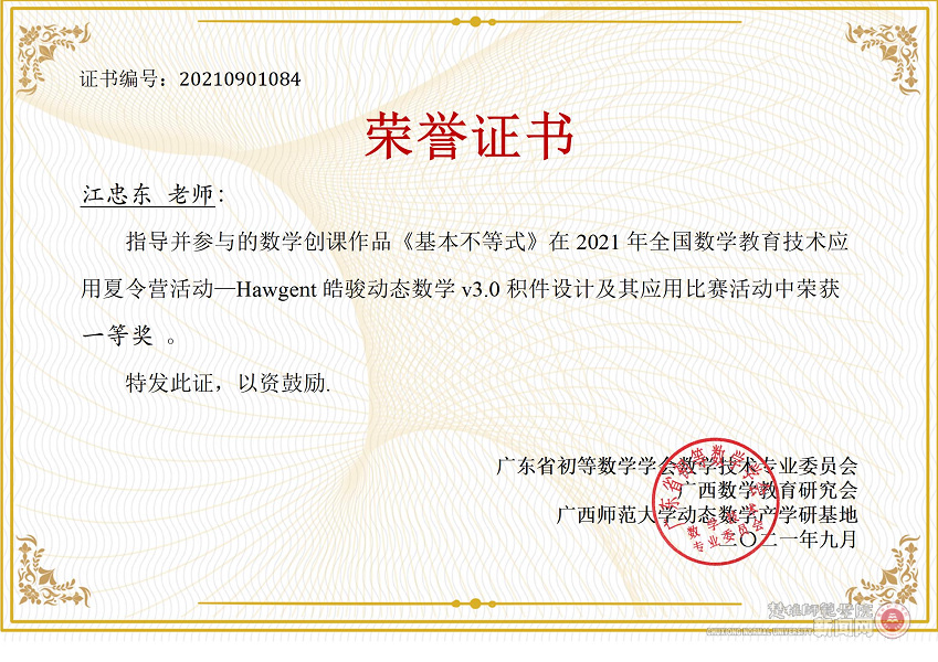 2021年8月10至9月1日,全国首届数学教育技术应用夏令营创课线上比赛成功举办,共有280多个代表队同台竞技。我校数学与计算机科学学院积极组队参赛,江忠东老师担任组长兼教练、黄勤友同学参加的代表队,以作品《乐想高中·基本不等式》荣获比赛一等奖。