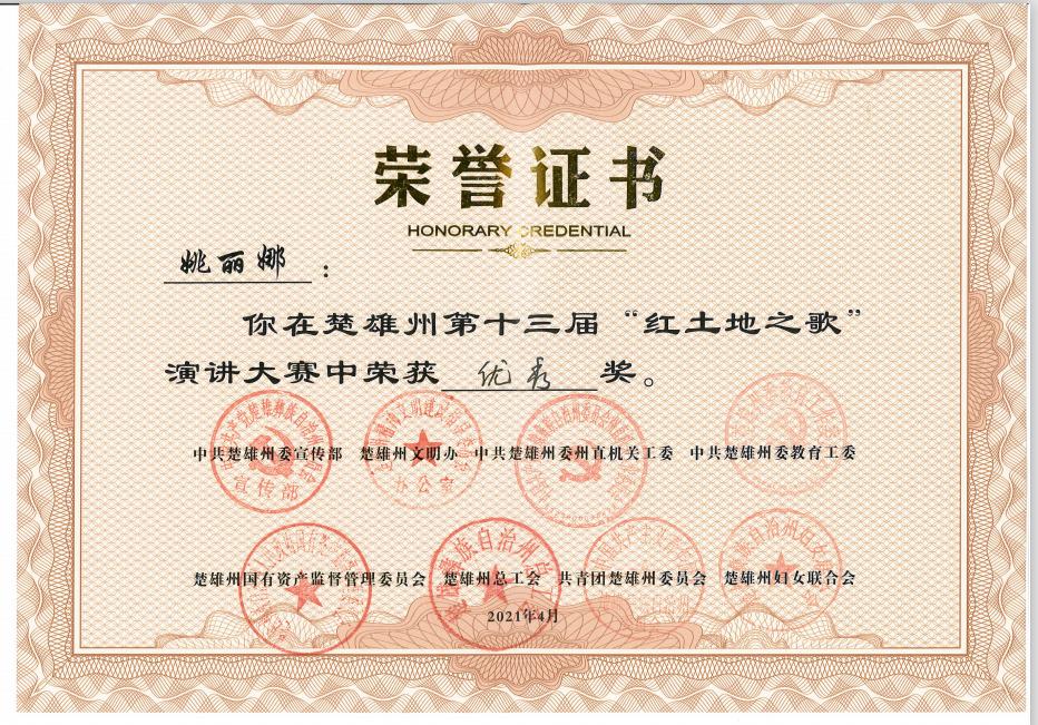 在“学党史、庆百年、心向党”党史学习教育中,我校紧紧围绕“庆建党百年 育时代新人”主题,积极组织参加楚雄州第十三届“红土地之歌”演讲比赛。经过三轮激烈角逐,我校教育学院选手秦寄玮、姚丽娜,以精彩的现场表现在全州总决赛中脱颖而出。秦寄玮同学以《凝望您,再前行》为题荣获三等奖、姚丽娜同学以《一盏星火照我心》为题荣获优秀奖。