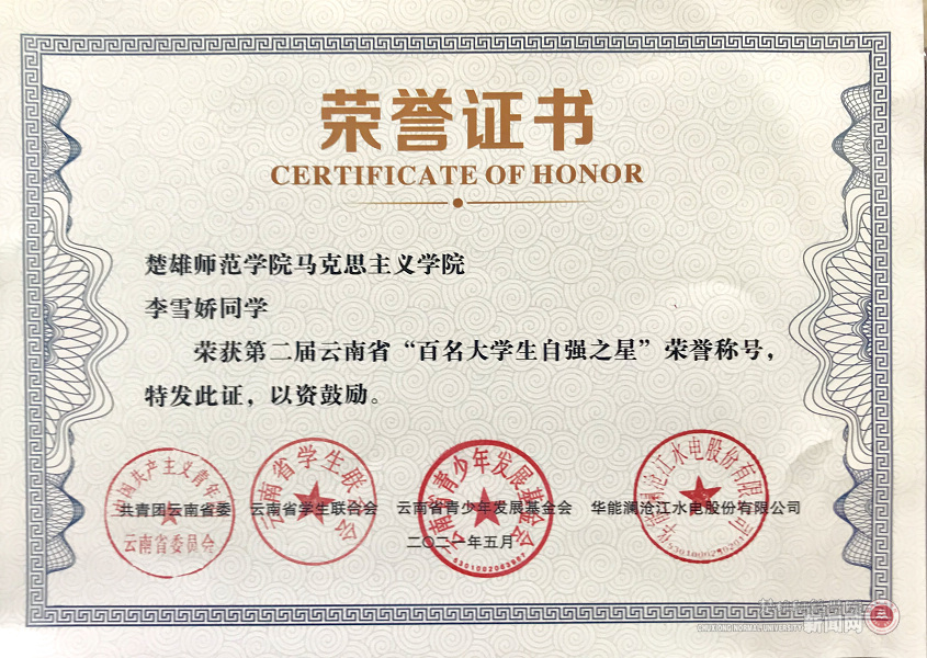 近日,“云南省百名大学生自强之星”结果揭晓,我校马克思主义学院学子李雪娇荣获第二届云南省“百名大学生自强之星”称号,活动经学校团委组织申报、推荐、校内公示、省级评选等环节,云南省共有100名同学被评选为“百名大学生自强之星”。