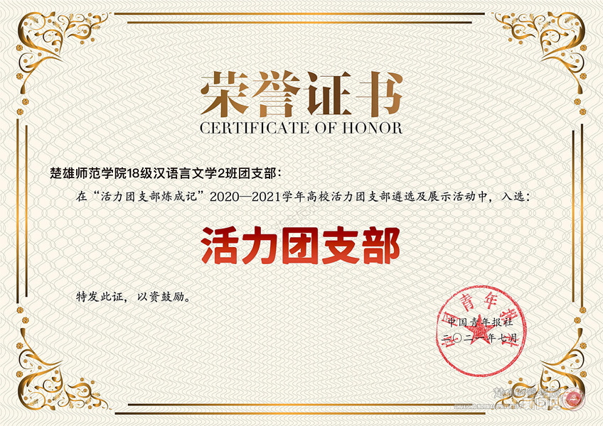 近日获悉,由团中央组织开展的2021年全国高校“活力团支部” 创建遴选活动结果揭晓。我校语言文化学院2018级汉语言文学专业2班团支部在全国1600个“活力团支部”候选单位中脱颖而出,被评为全国高校“活力团支部”的国家级荣誉称号。