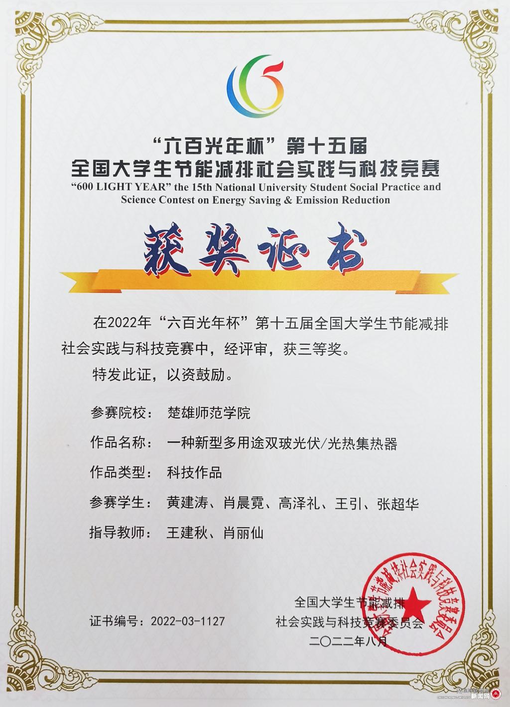 近日,2022年第十五届全国大学生节能减排社会实践与科技竞赛在天津大学落下帷幕。历时5个月,经全国大学生节能减排社会实践与科技竞赛委员会评审公布,我校物电学院2支团队作品荣获全国三等奖。