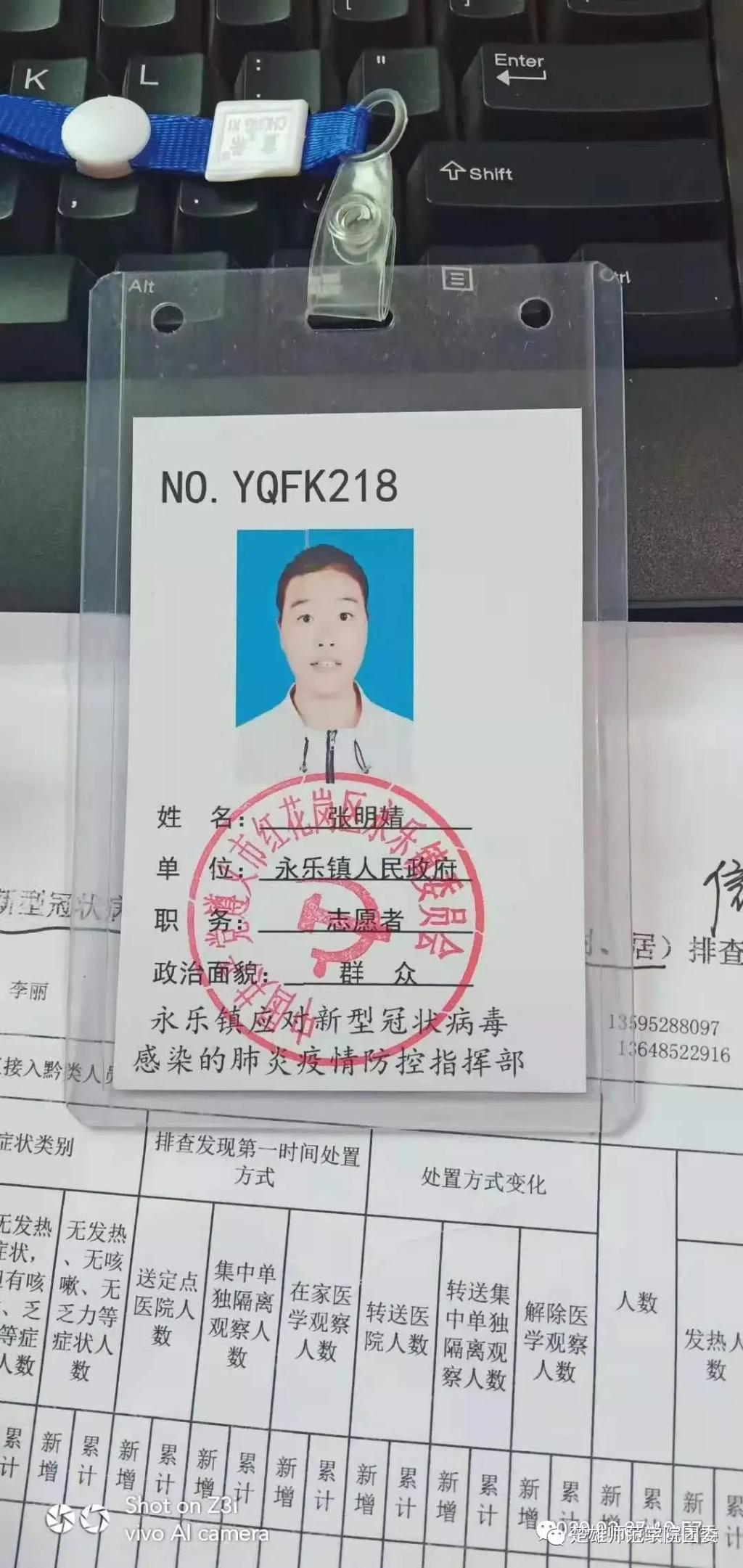 地旅学院地理科学专业2019级1班学生,政管青协志愿者张明婧,志愿报名参与遵义市红花岗区永乐镇疫情防控工作,从2月3日起每天统计每个村居民的流入人口和流出人口并且一一打电话慰问有武汉居住史和有接触武汉人员的群众。然后悉心地分析疫情情况,提醒他们不要出门,注意卫生,还到卡点帮助其他工作人员一起分担来往人员排查等工作。