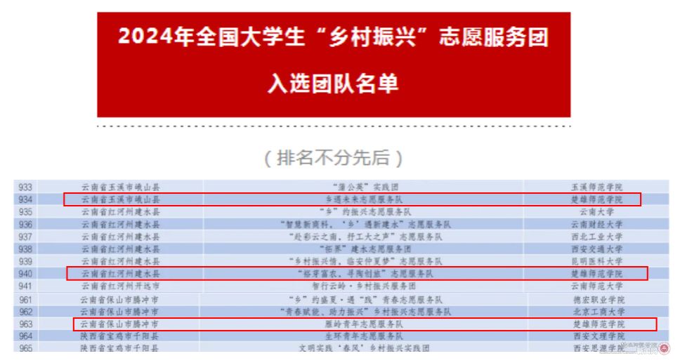 近日,团中央青年志愿者行动指导中心、中国农业发展银行联合公布2024年全国大学生“乡村振兴”志愿服务团入选团队名单。我校“乡遇未来志愿服务队”“裕芽富农,寻陶创旅志愿服务队”“雁岭青年志愿服务队”3支团队成功入选。