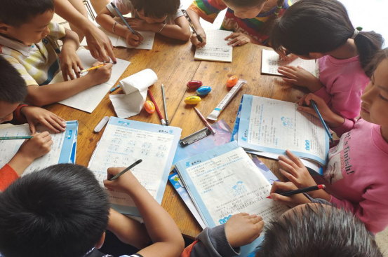 图为实践团成员帮留守孩子们进行作业辅导并帮助他们检查核对。中国青年网通讯员王思齐摄