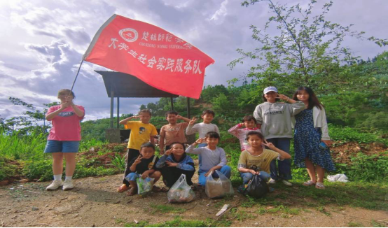 图为实践团队成员和留守孩子们义务捡垃圾结束后进行合影留念。中国青年网通讯员王思齐摄
