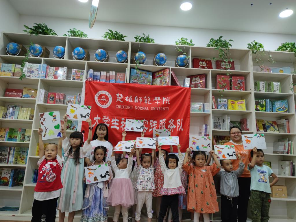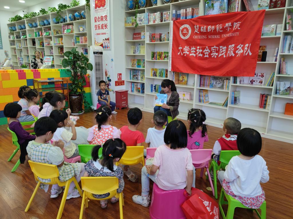 导语:2021年7月14日至7月18日,楚雄师范学院教育学院邓琴 、王燕、冯佳敏、李辈蓉、罗元菊、白一凡、李幸奎、李宇龙、刘雨佳,9名教育学院赴鹿城镇“三下乡”教育关爱服务暑期社会实践团成员,在指导教师王艳梅老师的带领下,于楚雄市鹿城镇兆顺第一城A栋三楼新知图书,进行3—6岁幼儿绘本阅读推广活动,活动旨在为3—6岁幼儿亲子家庭提供公益且专业的绘本阅读指导,弘扬大学生为社会服务精神。