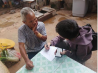 图为团队成员在石屏县符家营村针对不会填写问卷的居民对问卷上的问题以问答并帮助填写的方式进行相关内容的填写工作。