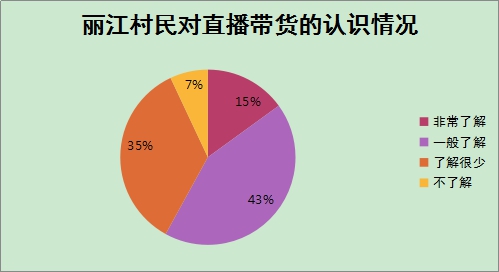 根据三维饼图,有43%的村民对直播带货一般了解,有35%的村民对直播带货了解很少。只有15%的村民对直播带货非常了解。助农团队薛昆和常开单两名同学得出以下结论:目前村民直播带货的意识不够强,政府还需加大对农户的宣传力度,鼓励农户多多采用直播带货模式进行水果销售。