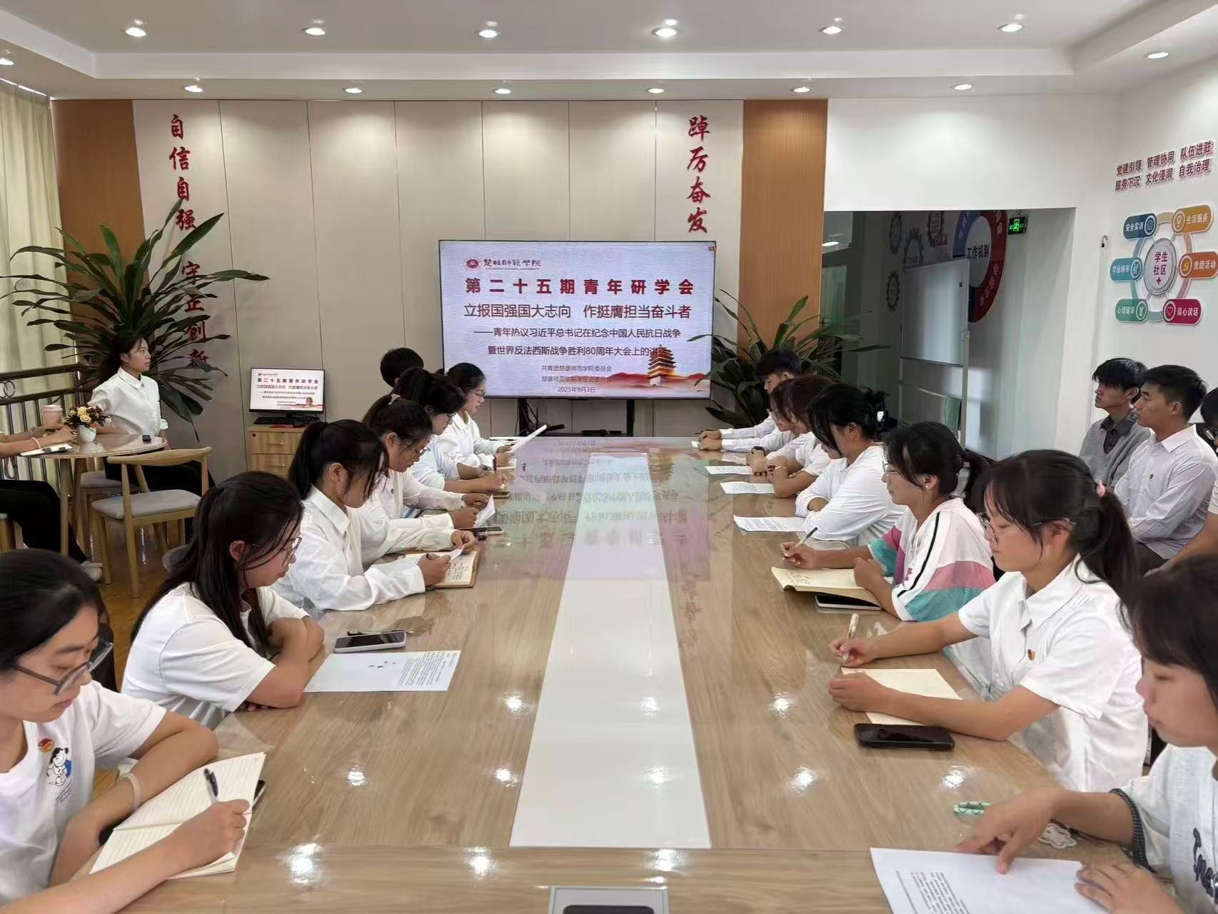 为深入学习领会习近平总书记致全国青联十四届全委会和全国学联二十八大的贺信精神,引导广大青年学子坚定理想信念、增强历史责任感和时代使命感。9月3日下午,“立报国强国大志向,作挺膺担当奋斗者”第二十五期青年研学会在花果山校区一站式学生社区服务站召开。校团委副书记赵慧、校学生会、学生社团部、各学院学生代表参加会议。