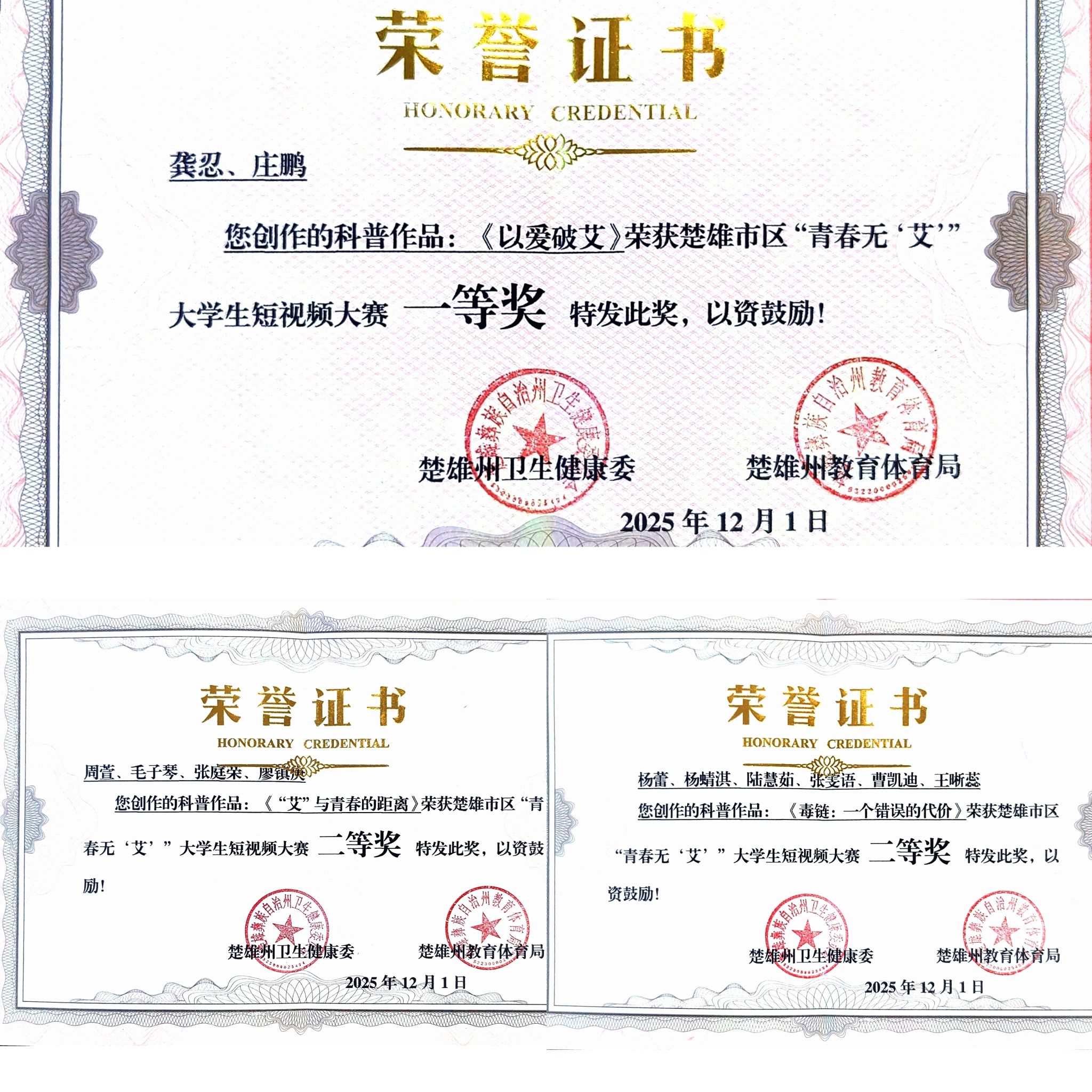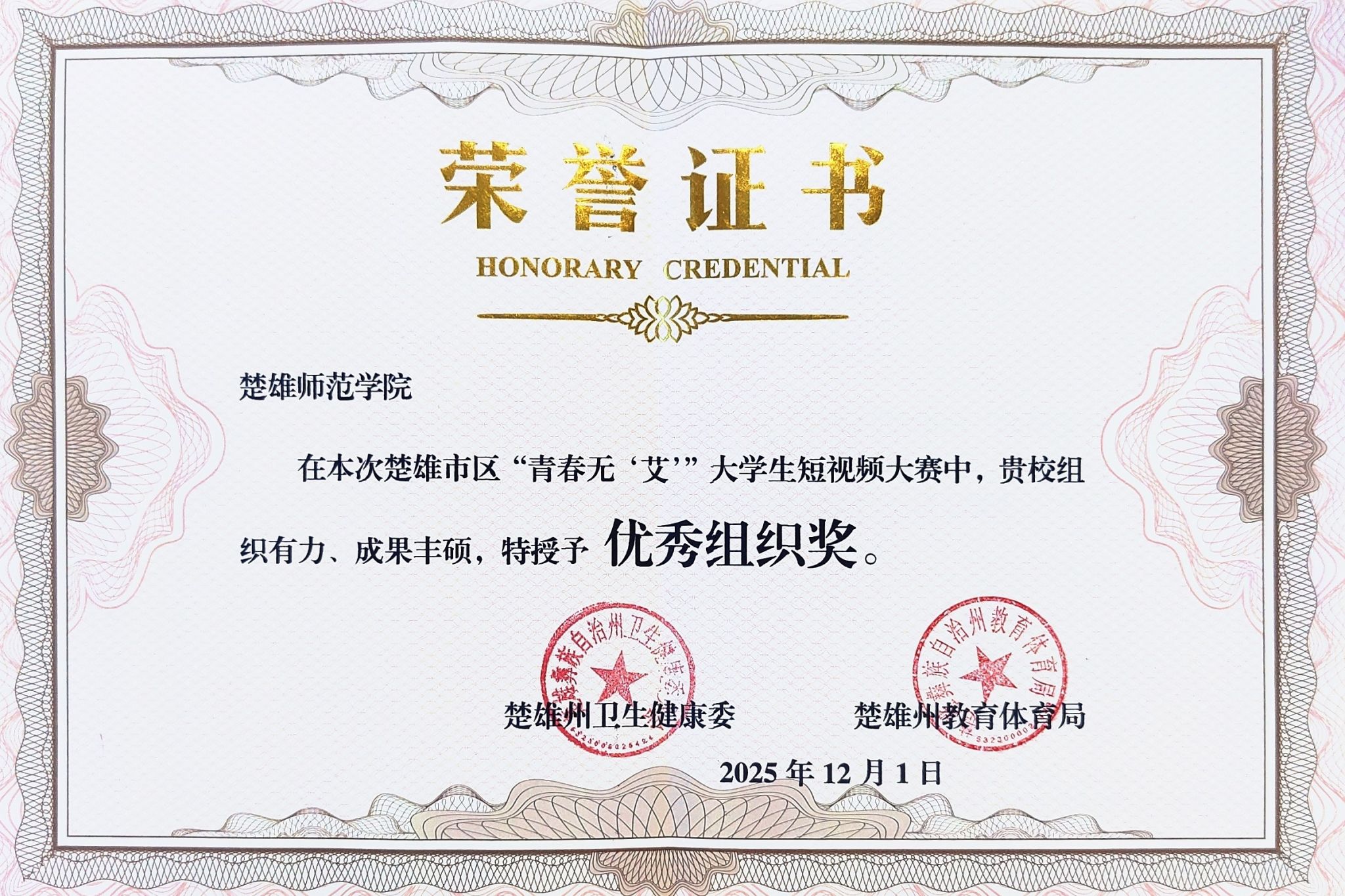 近日,由楚雄彝族自治州卫生健康委员会、楚雄彝族自治州教育体育局主办,楚雄师范学院协办的2025年楚雄城区大学生“青春无‘艾’,健康同行”预防艾滋病短视频大赛圆满落幕。我校在本次比赛中组织有序、表现优异,荣获“优秀组织奖”。