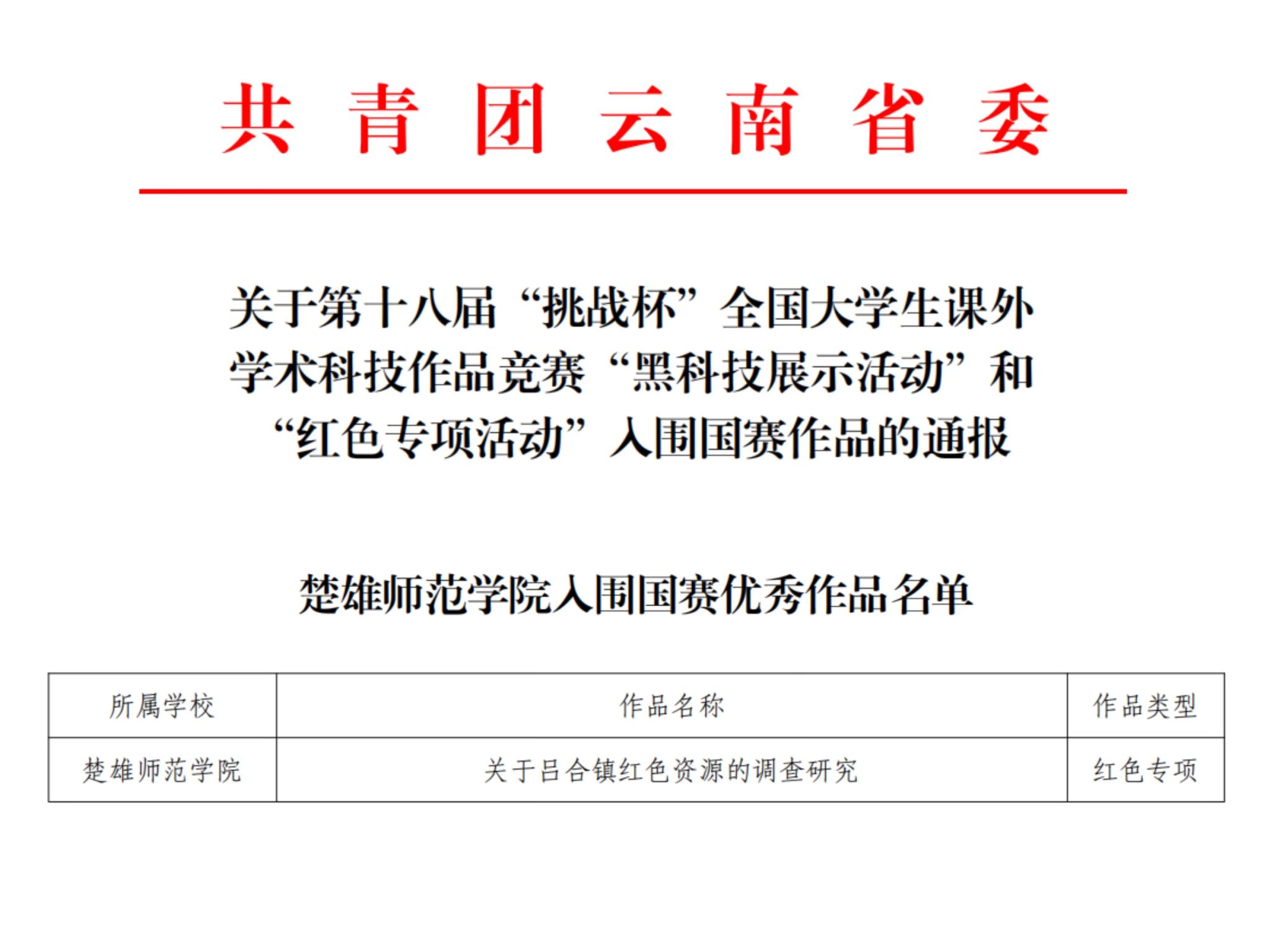 近日,由共青团中央、中国科协、教育部、中国社科院、全国学联共同主办的第十八届“挑战杯”红色专项活动云南省推报国赛作品名单公布。我校语言文化学院英语专业学生许丽君团队(团队成员:陈倩、赵鑫耘、李超、丰园昊、赵香鹏、孔泽,指导老师:杨春梅)的作品“关于吕合镇红色资源的调查研究”入围“红色专项活动”国赛优秀作品名单。