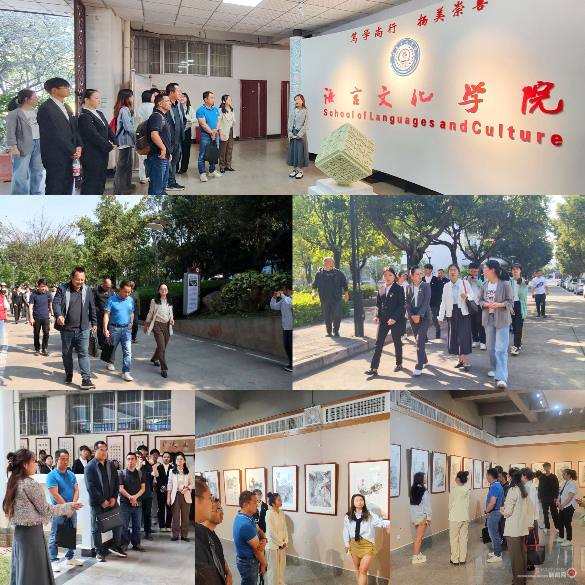 6所结对共建高校师生分别参观了教育学院师范生板书板画作品展、语言文化学院书法作品长廊及汉字文化体验馆,观摩指导语言文化学院2021级汉语言文学2班学生团支部主题团日活动,参观图书馆一楼展厅的美术学专业“黔里绘江山”贵州主题采风作品展。