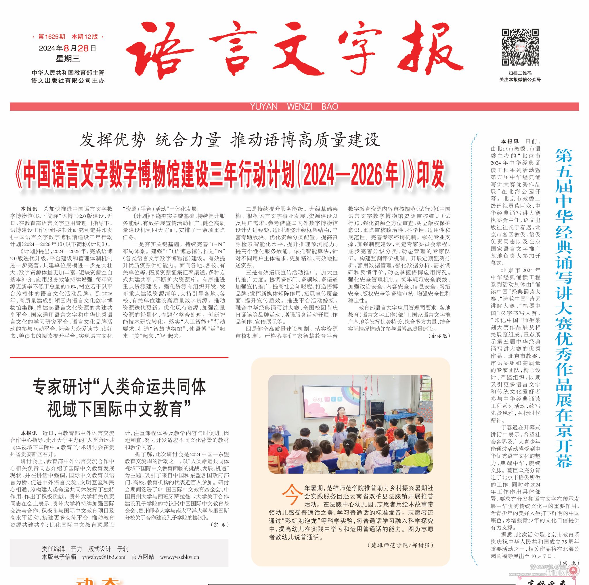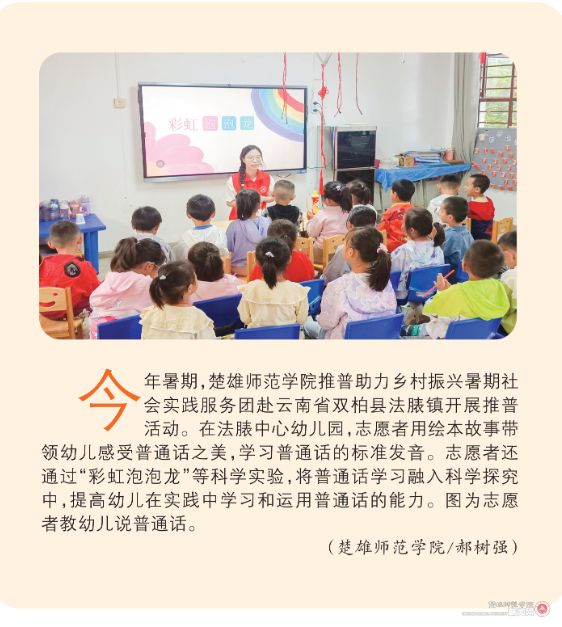 8月28日,《语言文字报》(第1625期)刊载我校推普助力乡村振兴社会实践项目,报道我校社会实践服务团队在暑假期间,深入双柏县法脿镇开展了一系列旨在推广普通话、赋能乡村振兴的社会实践活动。全文如下: