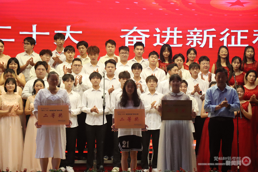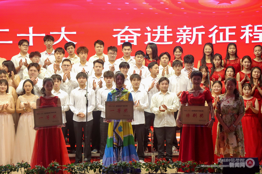 经过激烈角逐,教育学院专业队荣获本次歌咏比赛的特别奖,教育学院、马克思主义学院荣获一等奖,管理与经济学院、资源环境与化学学院、美术与艺术学院荣获二等奖,数学与计算机科学学院、语言文化学院、物理与电子科学学院、体育与健康学院荣获三等奖。王资和李正武为以上获奖队伍颁发荣誉证书并合影留念。