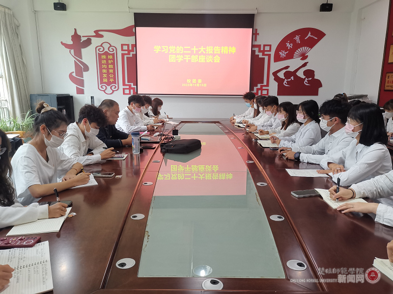 10月16日下午,由校团委组织的学习党的二十大报告精神团学干部座谈会在笃学楼128会议室召开,团委副书记邹治豪主持会议。