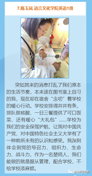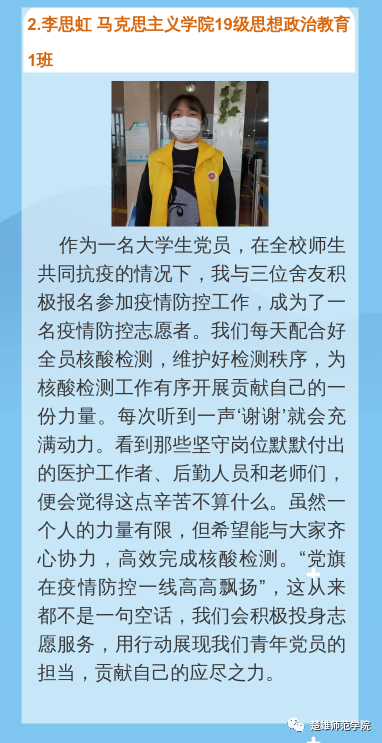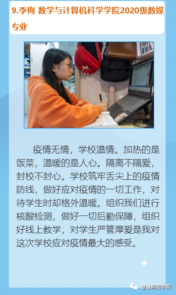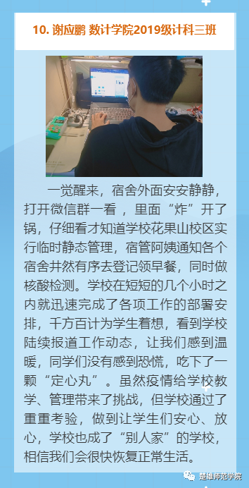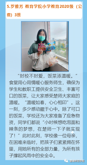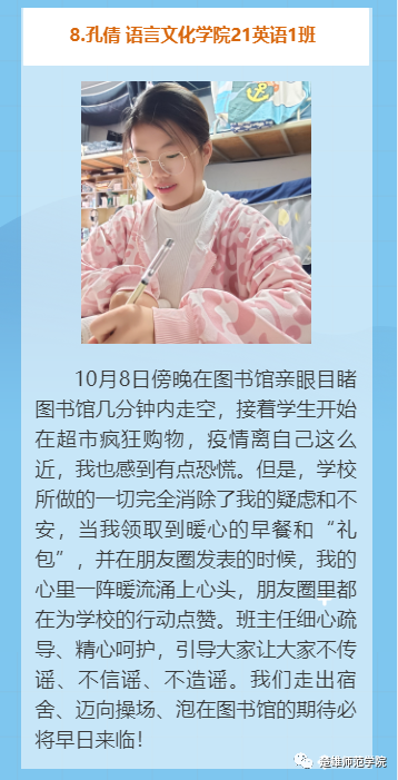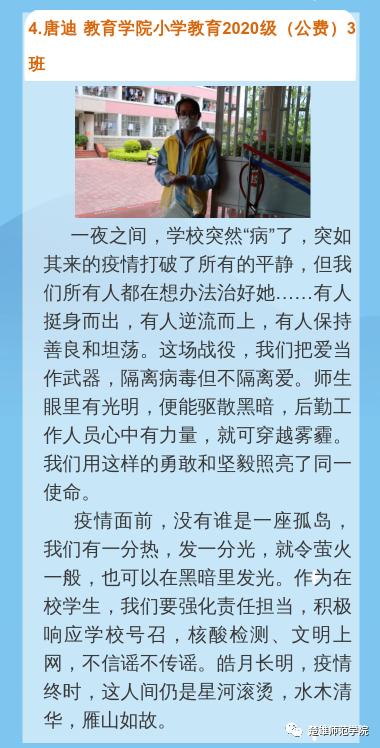 抗疫阵地就是课堂,战“疫”工作就是教材。10月9日起,学校“直播”着一场盛大的抗疫思政大课。面对突如其来的疫情大考,学校从严从快,从实从细精心抓好疫情防控,全校师生同心抗疫,共克时艰。在做好每一件小事、完成每一个任务、履行每一项职责中上好这堂直抵人心、传递正能量、提振精气神的“大思政课”,践行初心使命,是学校党委和每一位师生必须答好的思政课作业。让我们一起“疫”苦“思”甜,倾听他们的心声和感悟。